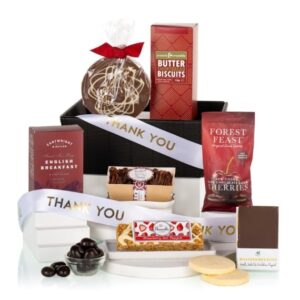 Our Thank You Gift hamper is a sweet and thoughtful way to show appreciation, featuring shortbread, flapjacks, cake, chocolate, cherries and English Breakfast Tea. Presented in a stylish fluted tray, it’s the perfect gesture of gratitude. This hamper contains 7 items: Bramble Foods Strawberry Jam Flapjack 80g British Bakes & Cakes Chocolate Mini Loaf Cake 90g Cartwright & Butler English Breakfast 10 Finest Tea Bags 30g Crunch & Crumble Shortbread 150g Forest Feast 60% Cocoa Dark Chocolate Sour Cherries 40g Stas Milk Chocolate Disc 65g Yorkshire Flapjack Millionaires Slice 80g Packed in black Kraft tray with thank you ribbon.